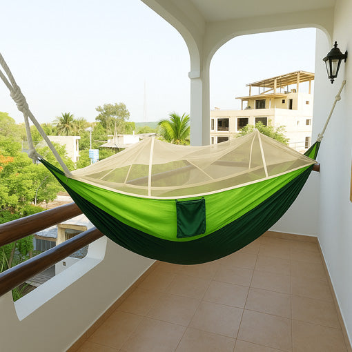 A diferencia de otras hamacas o sillones colgantes, la Hamaca Antimosquitos 3000 cuenta con un toldillo integrado que te protege completamente de mosquitos, sin necesidad de repelentes, velas o químicos.
