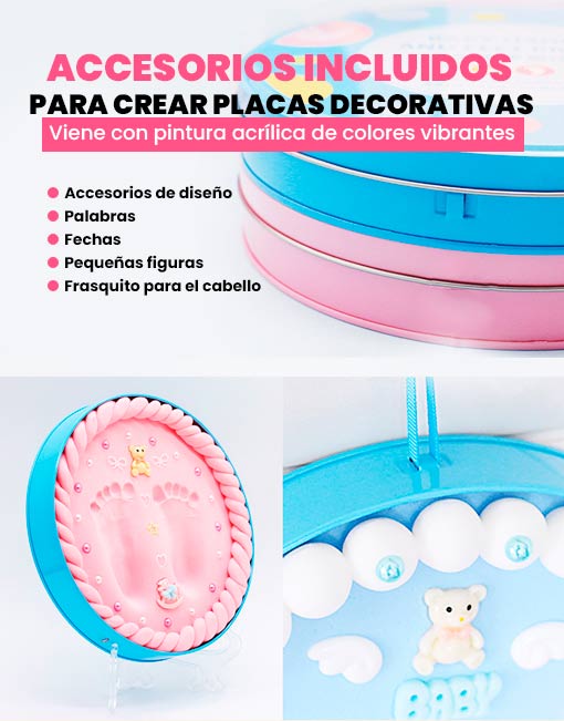Con nuestro kit, podrás guardar las huellitas, un mechón de su cabello y adornarlo con su nombre, fechas y más